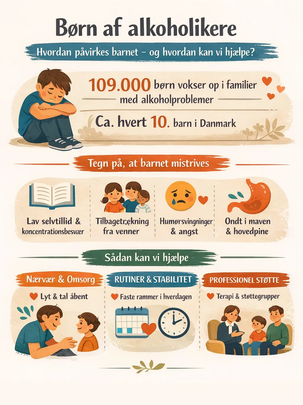 Børn, der vokser op med alkoholproblemer i familien, har ofte brug for ekstra hjælp til at få styr på egne følelser, relationer og trivsel. Psykologer, socialrådgivere og terapeuter kan give viden og værktøjer, som gør, at barnet ikke står alene med sine oplevelser.